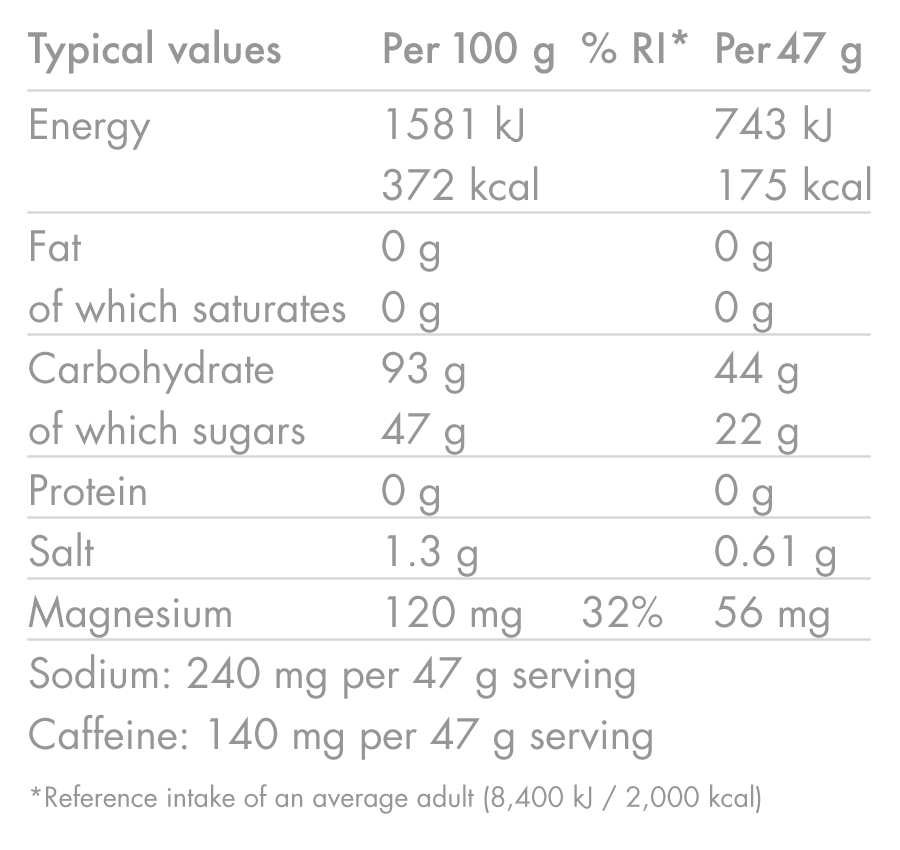 Dit individuele zakje van de CAFFEINE HIT combineert een dosis hoge dosis cafeïne (140 mg) met snel opneembare koolhydraten en elektrolytenter ondersteuning van het fysieke en mentale uithoudingsvermogen tijdens de meest veeleisende inspanningen.