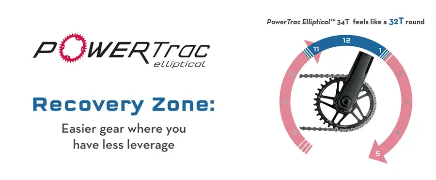 Le design ovale PowerTrac de Wolf Tooth améliore la puissance, la traction et réduit les changements de vitesse, tout en conservant un pédalage fluide et naturel. Grâce à une variation du diamètre, le plateau optimise l’effort entre Power Zone (puissance maximale) et Recovery Zone (effort réduit), agissant comme deux dentures en une.
