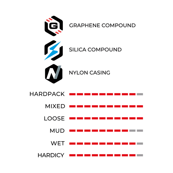 De progressief gegroefde zijlamellen bieden uitstekende grip in bochten en perfecte stabiliteit op hellende vlakken. Bij het klimmen zorgen de getrapte randen voor krachtige tractie, ideaal voor technische secties en explosieve relaunches. De brede afstand tussen de noppen zorgt ervoor dat modder en vuil makkelijker weg kunnen, voor constante grip op los en nat terrein.