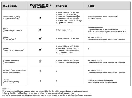 Compatible avec les compteurs Garmin, Wahoo et Hammerhead, l’Éclairage Arrière RAVEMEN NT201 s’intègre parfaitement à l’écosystème du cycliste connecté. Les informations de trafic sont affichées de manière claire et instantanée, permettant d’anticiper l’environnement arrière et d’adapter la conduite en conséquence.