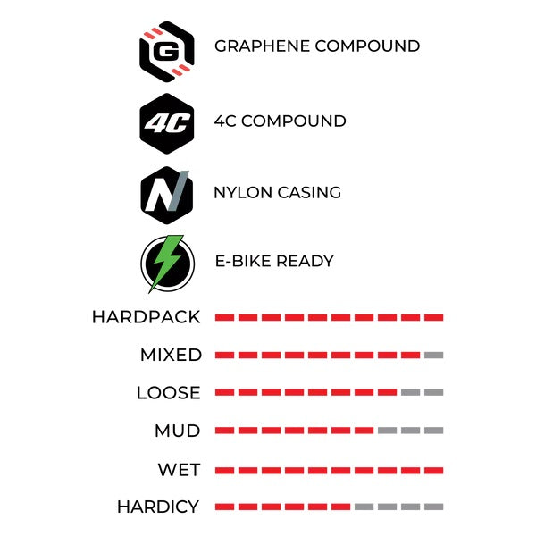 La bande de roulement 4C est composée de 4 zones de graphène qui permettent une plus grande résistance ainsi qu'une traction inégalée sur les parcours techniques. Le E-Agarro est également conçu autour d'une carcasse Trail TNT de 120 TPI garantissant de hautes performances et une résistance supéreure aux déchirures et les crevaisons par pincement.