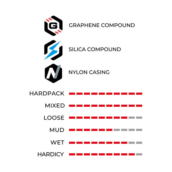 La gomme 1C Race en Graphene + Silica assure un grip souple et tenace, idéale pour l’enduro de haut niveau. Sa carcasse ultra-renforcée Enduro Race en nylon intègre un renfort central, une protection anti-crevaison de tringle à tringle et une barrière contre les pincements dus aux impacts de jante. Avec sa technologie Bead Shield, ce pneu offre une durabilité et une fiabilité exceptionnelles sur les tracés les plus exigeants. De plus, un insert en matériau caoutchouc haute technologie offre une protection contre les chocs sur la jante et un soutien latéral, garantissant une résistance et une stabilité accrues sur les tracés les plus exigeants.